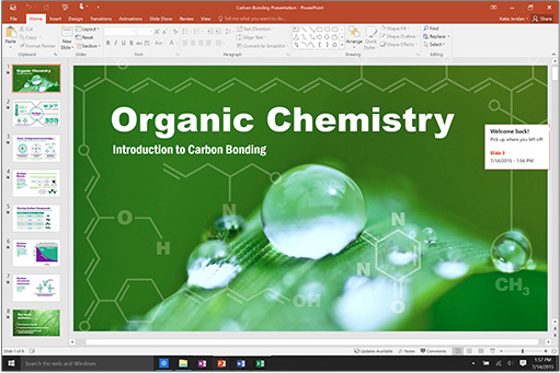 通過全新的幻燈片切換和改進(jìn)的動(dòng)畫任務(wù)窗格創(chuàng)建、協(xié)作和高效展現(xiàn)自己的思路。 幻燈片旁邊按線索組織的備注幫助您將反饋融入到演示文稿。 此外,演示者視圖在 Mac 上顯示當(dāng)前幻燈片、下一張幻燈片、備注文稿以及計(jì)時(shí)器,同時(shí)僅在大屏幕上向您的觀眾投影演示文稿。